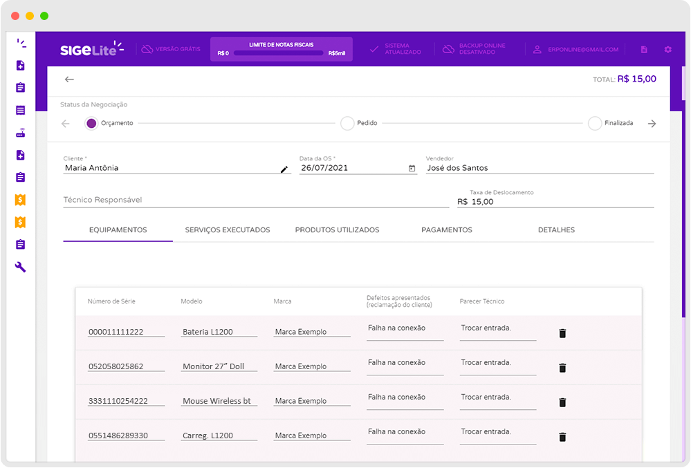O SIGE Lite é uma ferramenta de fácil utilização, estando adequada a diversos tipos de serviços. Possui integração automática com o estoque, bem como com o módulo financeiro para controle de todas as contas a receber.