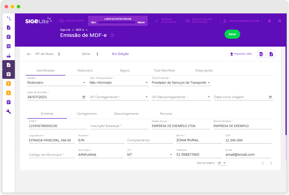 Sem dúvida, de todas as qualidades do SIGE Lite, o fato de ser um emissor gratuito de verdade é um grande diferencial. Moderno, rápido e muito fácil de usar, nosso Sistema ERP automatiza processos como o preenchimento dos campos do seu MDF-e, que carregam conforme os dados já cadastrados em seu sistema.